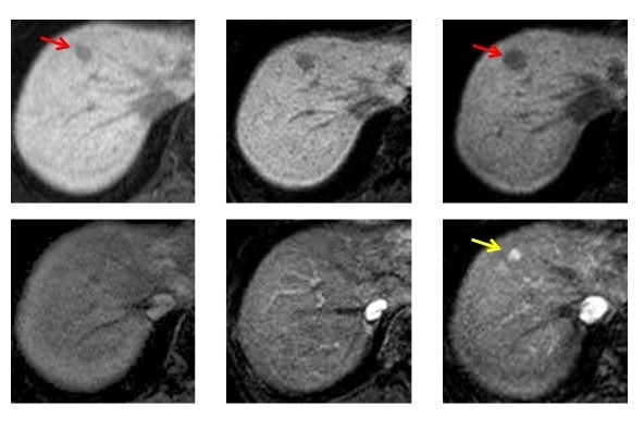 図3:MRI検査でみられる、非常に早期な腫瘍(赤い矢印)の肝細胞癌(黄色の矢印)への進行