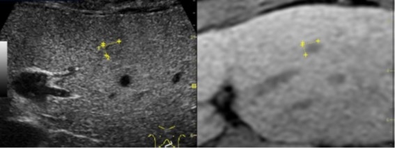 図6:MRI画像(右)とエコー画像(左)を同期させたより確実な肝細胞癌の描出(黄色で示すのが肝細胞癌)
