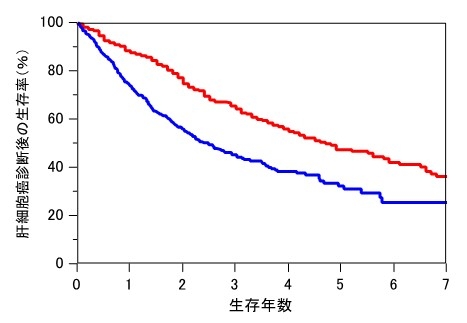 そういう意味では、癌ができるのを防ぐだけでなく、周りの肝臓を弱らせない方策も大切です。上述のように最近ではB型肝炎・C型肝炎ではウイルスを抑える内服薬があり、これによって「肝炎」で肝臓が弱るのを防ぐことができます。このため癌の治療も積極的にでき、肝細胞癌患者の寿命は改善しています(図4・5)。