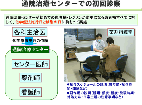 初回診察では、通院治療センター医師、薬剤師、看護師より、治療内容・治療スケジュール・副作用・治療中の日常生活で注意すべき点などを説明させていただきます。そして、患者さんから化学療法を受ける同意を頂き、治療日を決定します(初回診察の日には通院治療センターでの治療は行いません)。
