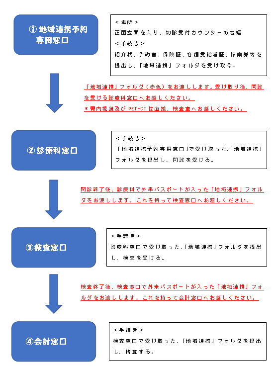 ・受付で、外来パスポートなどの書類の入った赤色のフォルダーをお渡ししますので、今回紹介された診療科の窓口に提出してください。